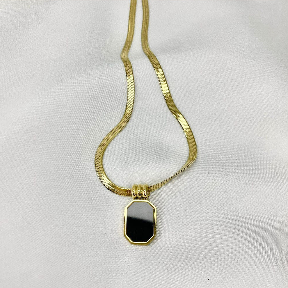 Make a statement with our Bold Black Onyx Style Pendant Necklace. Featuring a stunning octagon-shaped black pendant framed in a luxe gold setting, this necklace exudes confidence and elegance. The sleek herringbone chain adds a modern touch, making it ideal for evening looks or layering with other pieces.
