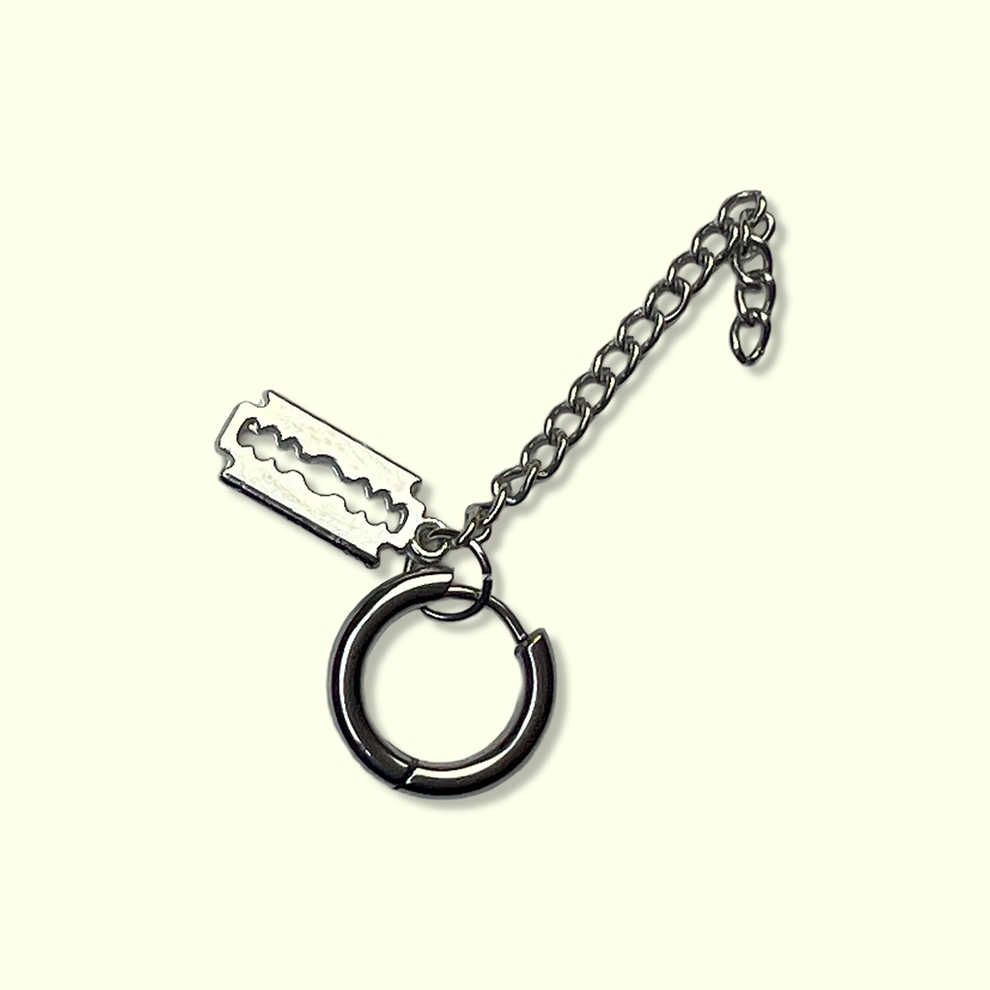 Make a daring statement with this unique silver hoop earring featuring a razor blade charm. Connected by a sleek chain, this edgy design adds an unconventional twist to your jewelry collection. Perfect for those who love a bit of attitude and a punk-inspired aesthetic, this earring is sure to turn heads. Whether worn solo or paired with other pieces, it brings a rebellious, modern flair to any look.