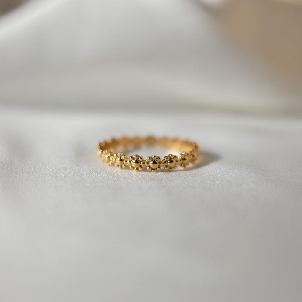 Three stackable rings featuring a textured bead pattern in gold, silver.